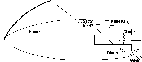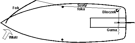 Rysunek przedstawia zasadę wykorzystywania naprężenia szotów foka do ustawienia slupa na samosterowność. Szot przeciąga rumpel w jedną stronę, w drugą rumpel ciągnięty jest przez linkę gumową. Takie sterowanie sprawdza się przy małym żaglu lub słabym wietrze czyli przy małych naprężeniach na szocie