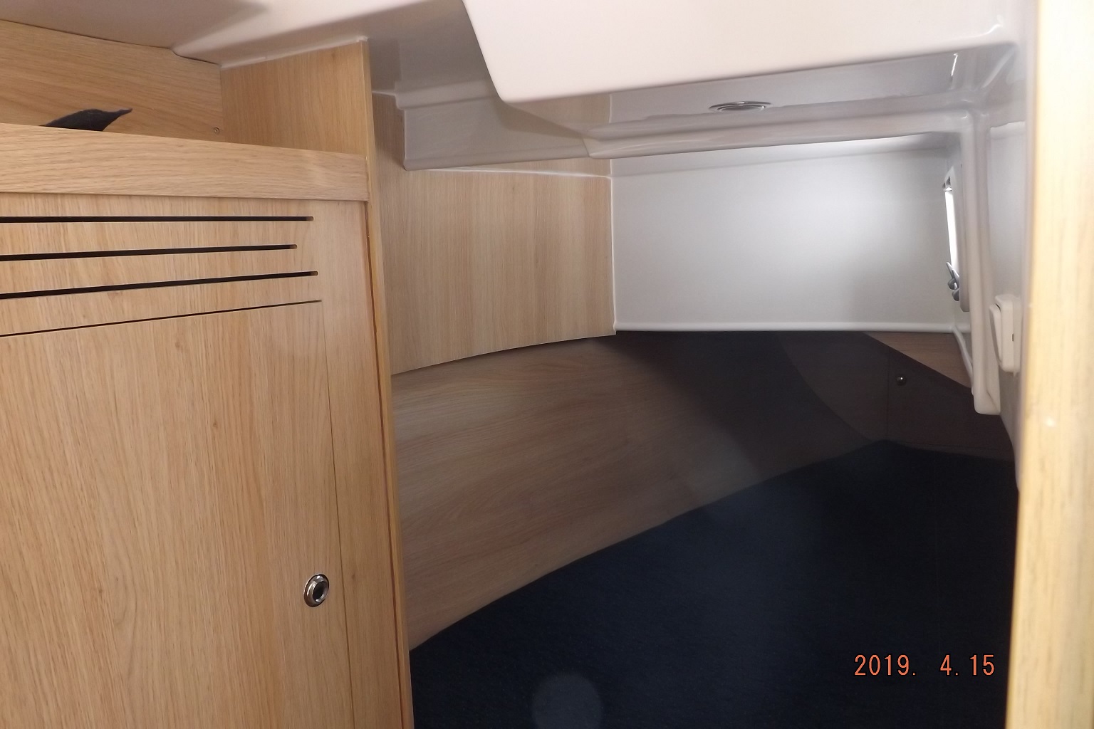 Wnętrze jachtu z wysokością stania jest obszerne i zaaranżowane tak aby zapewnić prywatność załodze w trzech zamykanych kabinach i możliwość wspólnego przebywania w messie dla nawet dziesięciu osób.