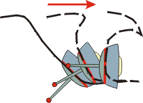 | Może być też inaczej. Zwróćmy uwagę na prądy powierzchniowe fali. Przy wolnym płynięciu szybkość i kierunek prądu grzbietu fali jest zgodny z kierunkiem płynięcia. Skuteczność działania steru znikoma. Jacht może zostać ustawiony równolegle do fali i znaleźć się w sytuacji przedstawionej na Rys.10. Burta zawietrzna, wtłaczana jest w wodę i hamowana w stosunku do nawietrznej. Mechanizm wywrotki przez burtę spowodowanej przez załamującą się falę przedstawiony na Rys.10. jest częściej spotykany. Fala nie musi być wypiętrzona do tak monstrualnych rozmiarów jak przy koziołkowaniu przez dziób. |