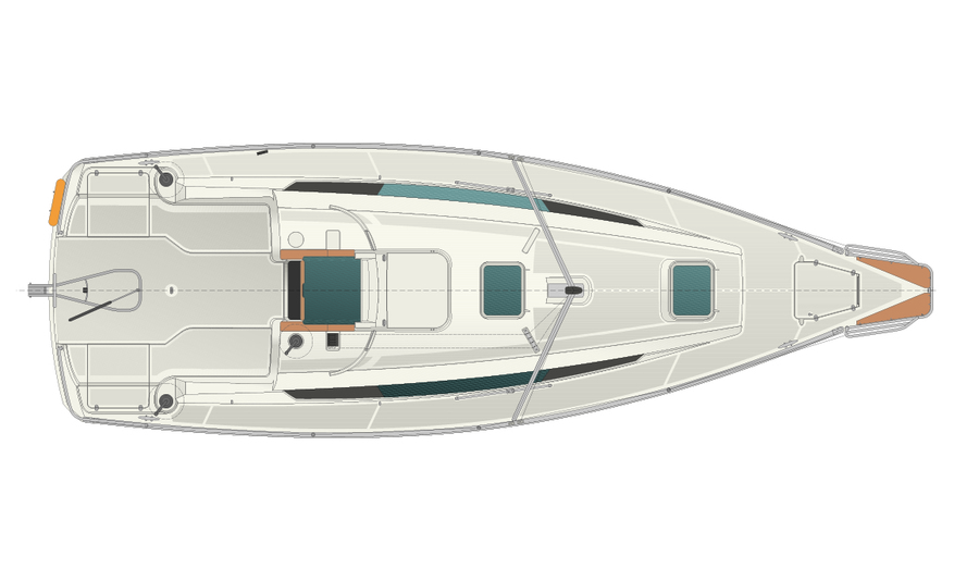 - Zamykana kabina dziobowa z dwuosobową koją oraz dużą otwieraną bakistą, dwie koje w mesie, dwie zamykane kabiny rufowe z podwójnymi kojami i szafkami