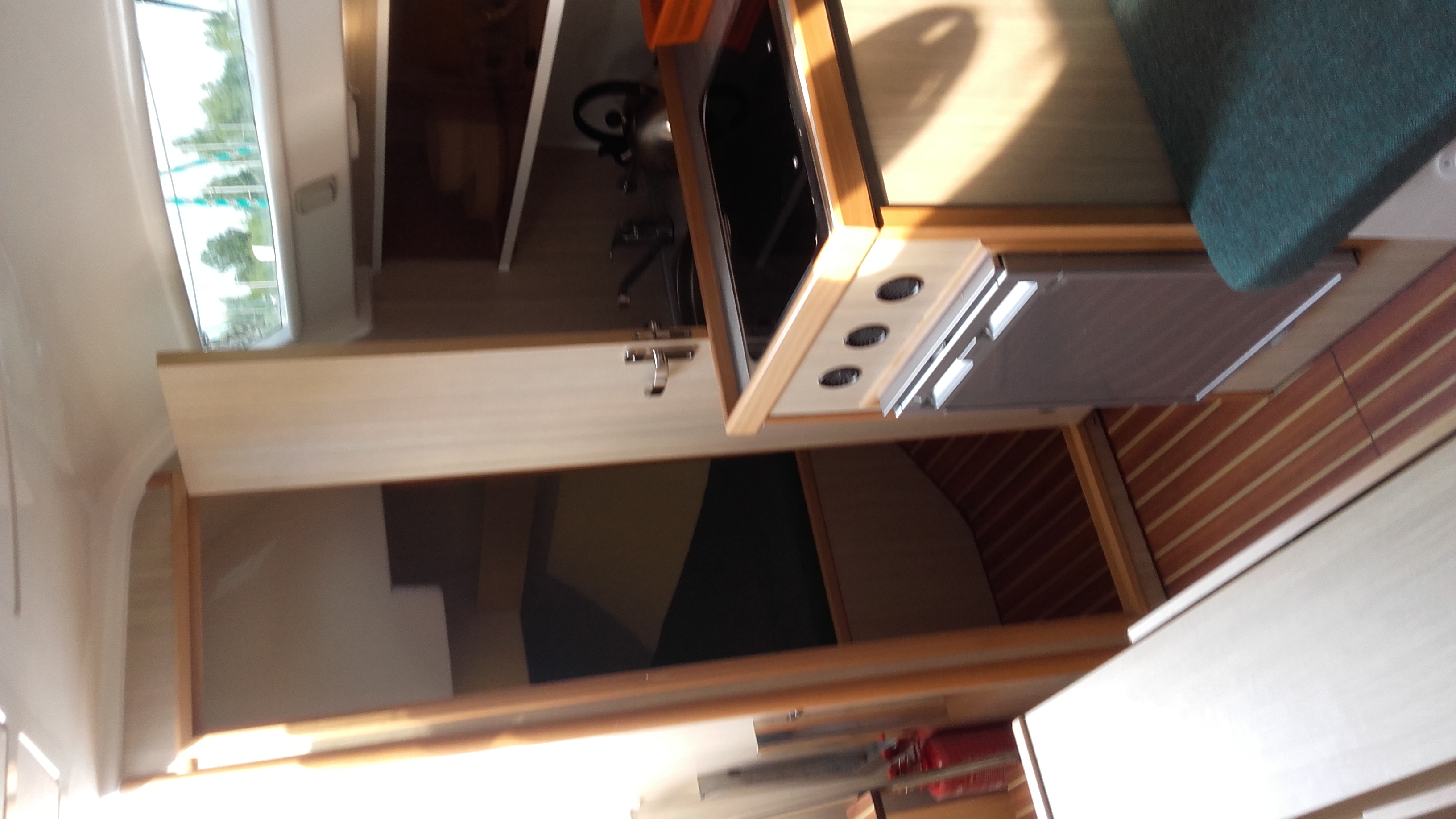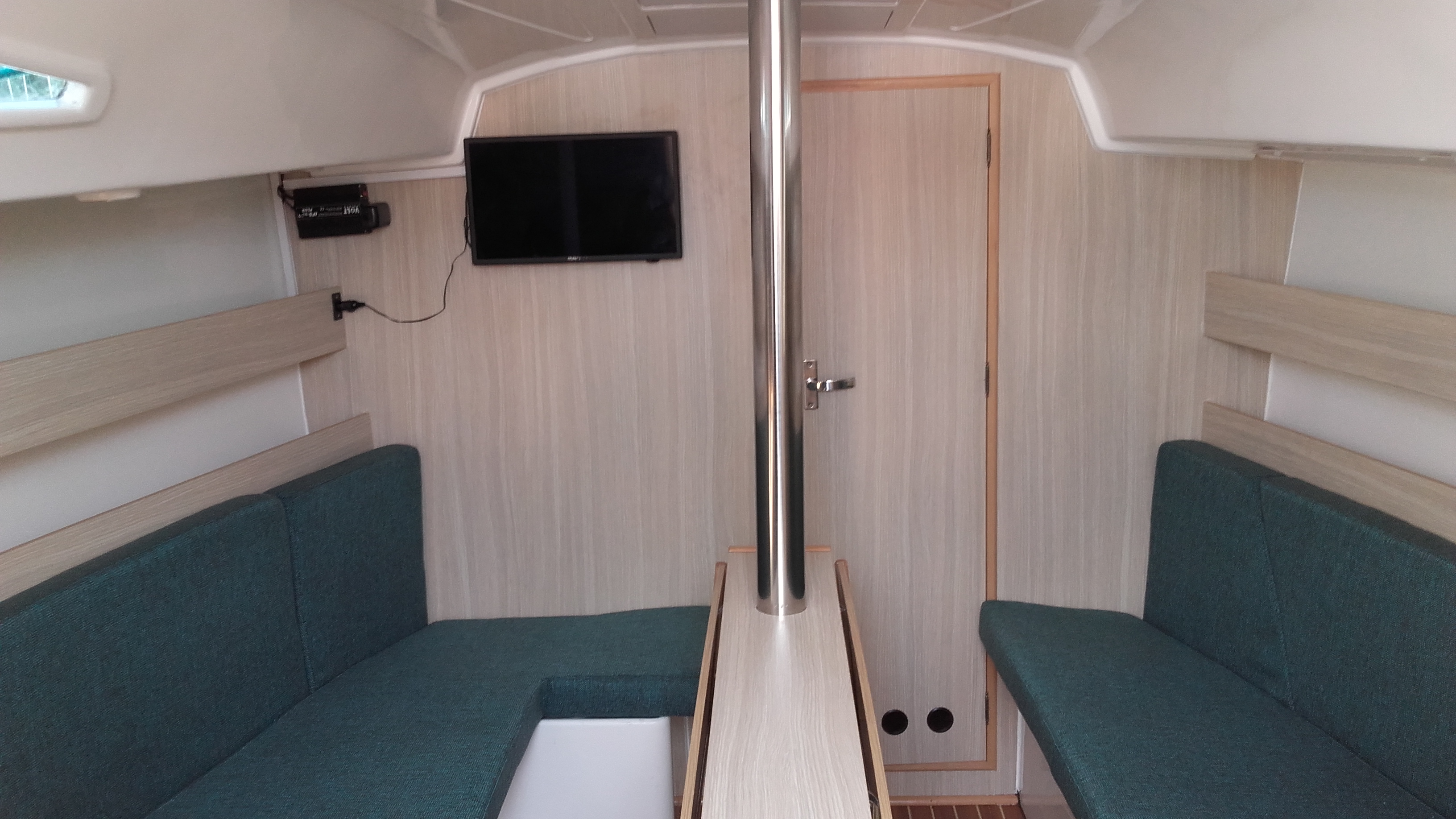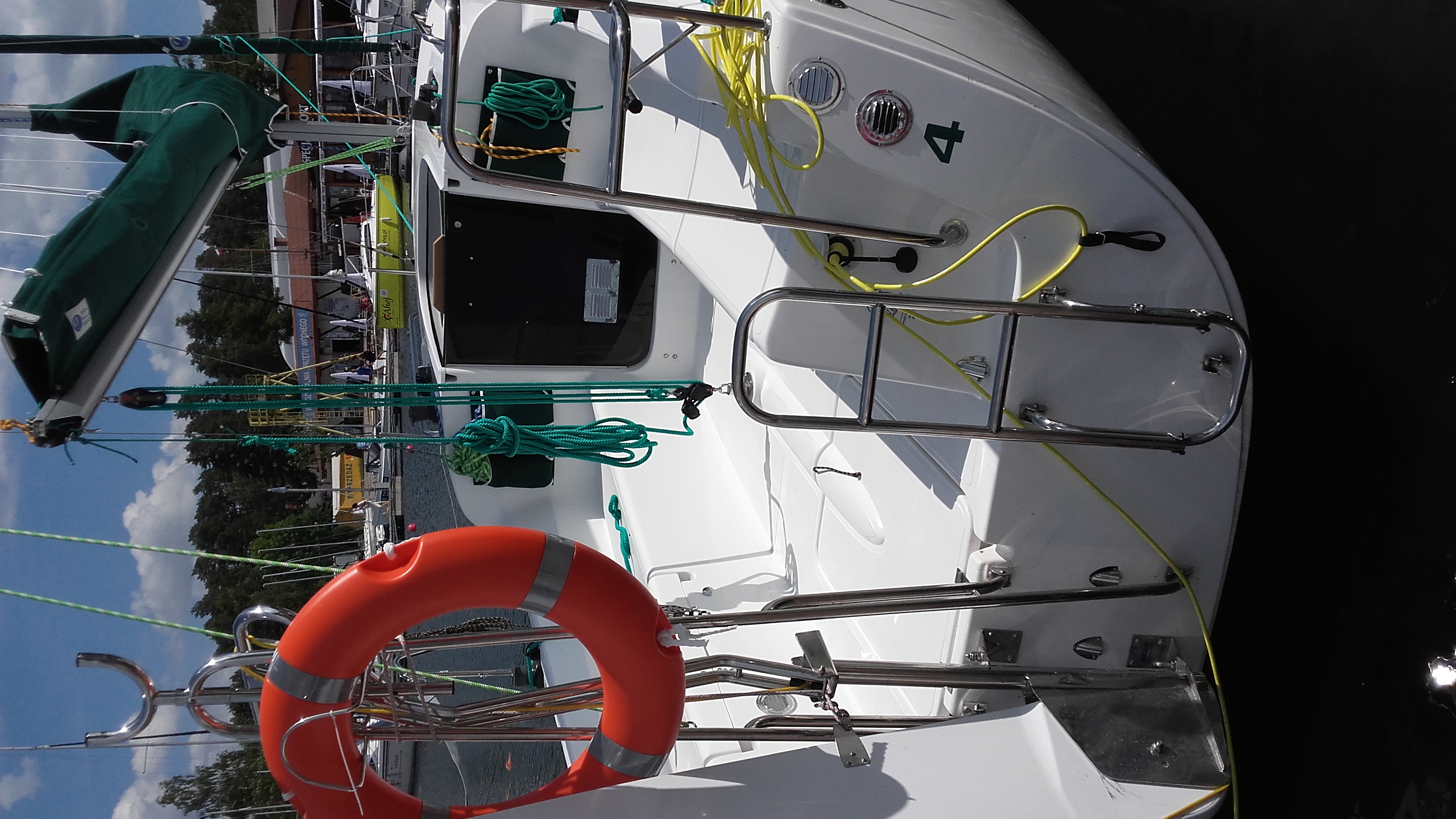 Wyposażenie dodatkowe: bramka do kladzenia masztu, sztywny sztag, roll fok, lazzy jack, instalacja wody - zbiornik, ciepła woda, radio, mp3, TV, lodówka, ogrzewanie, instalacja 230 V, oświetlenie kokpitu